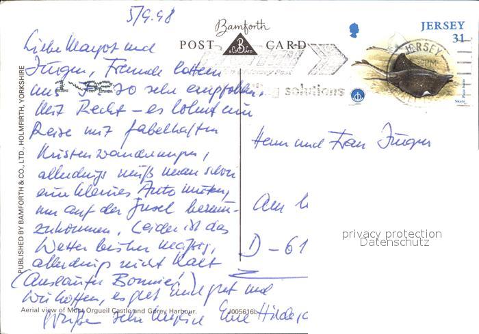 old postcard Jersey United Kingdom Aerial view of Mont Orgueil Castle and Gorey Harbour postalisch gelaufen Erhaltung siehe scans