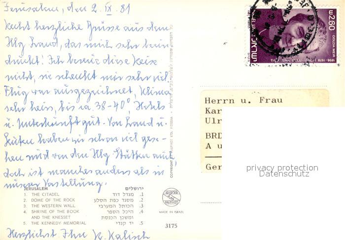 old postcard Jerusalem Yerushalayim Citadel Dome of the Rock Western Wall Shrine Kennedy Memorial postalisch gelaufen Erhaltung siehe scans [FriedD77]