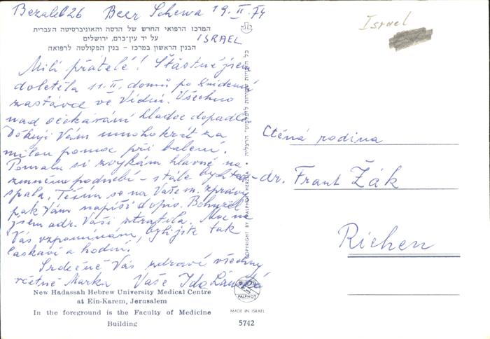 old postcard Jerusalem Yerushalayim Hebrew University of Medical Center postalisch gelaufen gute Erhaltung