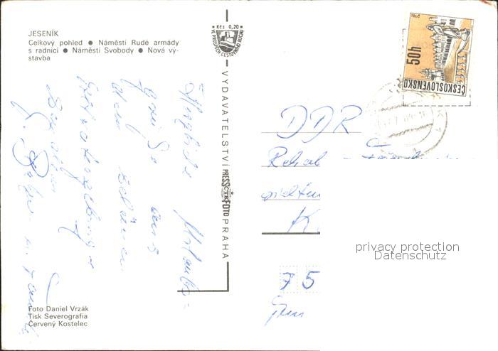old postcard Jesenik Celkovy pohled Namesti Rude armady s radnici Namesti Svobody Nova vystavba postalisch gelaufen Erhaltung siehe scans
