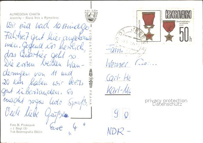 old postcard Jeseniky Gebirge Alfredova Chata Stara Ves u Rymarova postalisch gelaufen Erhaltung siehe scans