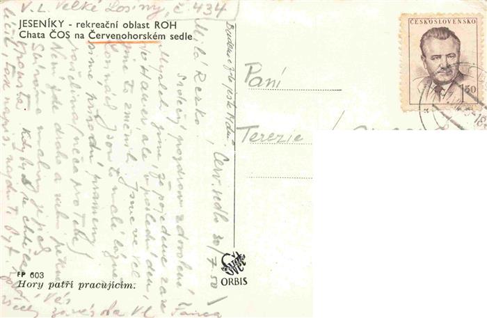 74014724 old postcard Jeseniky Jesenik Freiwaldau CZ Rekreacni oblast ROH Chata COS na Cervenohorskem sedle postalisch gelaufen Erhaltung siehe scans [WerneD78] KatCode: 11520