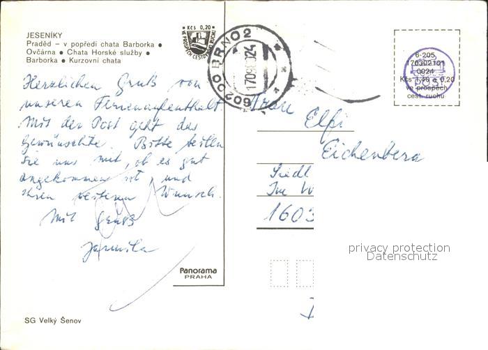 old postcard Jeseniky Praded v propredi chata Barborka Ovcarna Chata Horske sluzby Barborka Kurzovni chata postalisch gelaufen Erhaltung siehe scans