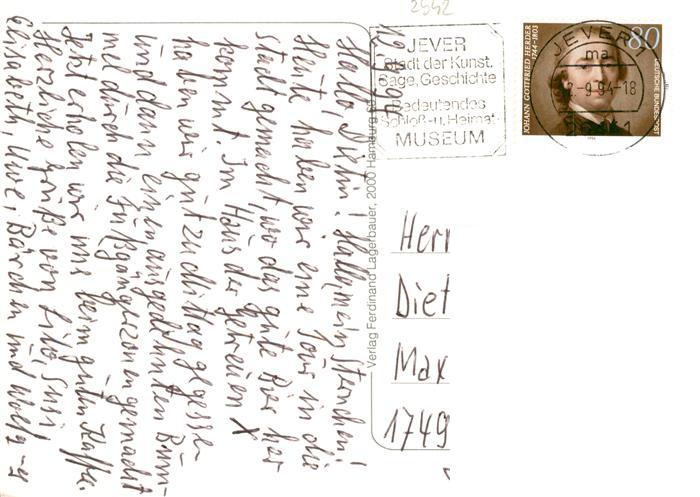 73930265 alte Postkarte Jever Elisabethufer Rathaus Schloss Am Markt Haus der Getreuen Windmuehle Marien Gymnasium postalisch gelaufen Erhaltung siehe scans [WerneD78] KatCode: 11110003455007