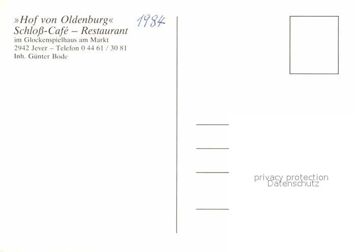 72726582 Jever Hof von Oldenburg Schloss Cafe im Glockenspielhaus postalisch nicht gelaufen Erhaltung siehe scans [WerneD78] KatCode: 11110003455007