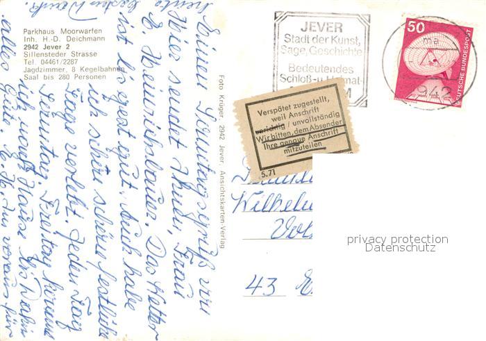 73648630 alte Postkarte Jever Parkhaus Moorwarfen Jagdzimmer Kegelbahnen Saal Terrasse postalisch gelaufen Erhaltung siehe scans [WerneD78] KatCode: 11110003455007
