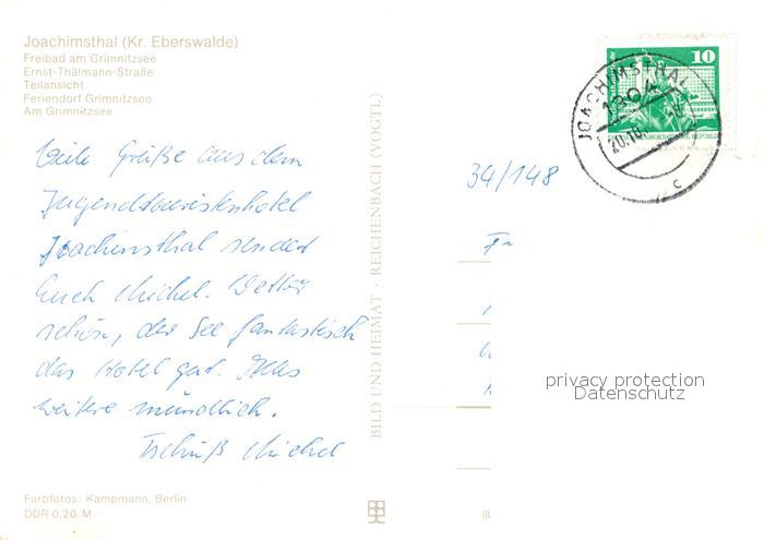 73060022 alte Postkarte Joachimsthal Freibad am Grimmitzsee Thaelmann Strasse Panorama Feriendorf Grimmitzsee postalisch gelaufen Erhaltung siehe scans [FriedD77] KatCode: 11110012060100