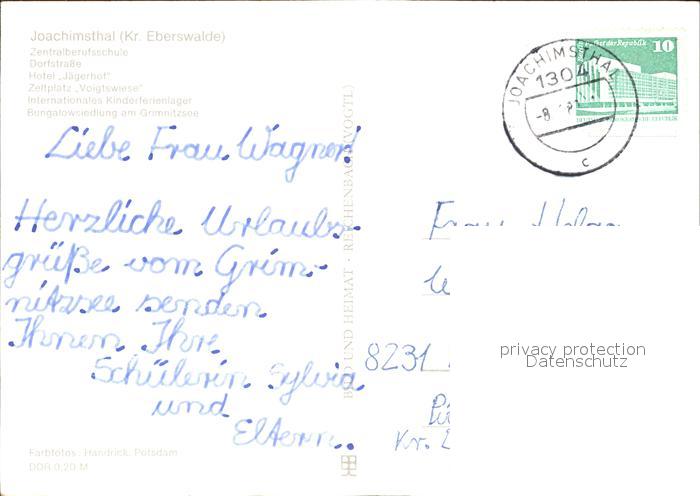72372003 alte Postkarte Joachimsthal Zentralberufsschule Dorfstr Hotel Jaegerhof Zeltplatz Voigtswiese Internat Kinderferienlager Grimnitzsee postalisch gelaufen Erhaltung siehe scans KatCode: 11110012060100