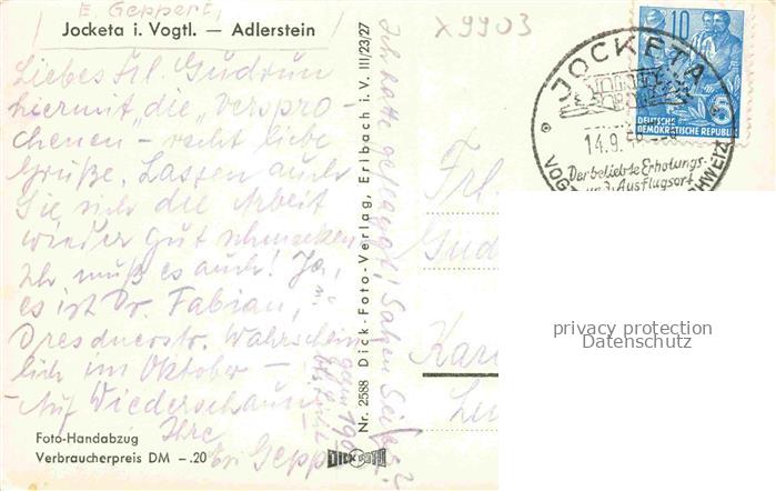 74087835 alte Postkarte Jocketa Adlerstein Gasthaus Handabzug postalisch gelaufen Erhaltung siehe scans [FriedD77] KatCode: 11110014178490