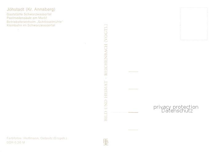73654438 Joehstadt Gaststaette Schwarzwassertal Postmeilensaeule am Markt Betriebsferienheim Schloesselmuehle Kleinbahn im Schwarzwassertal postalisch nicht gelaufen Erhaltung siehe scans [WerneD78] KatCode: 11110014171190
