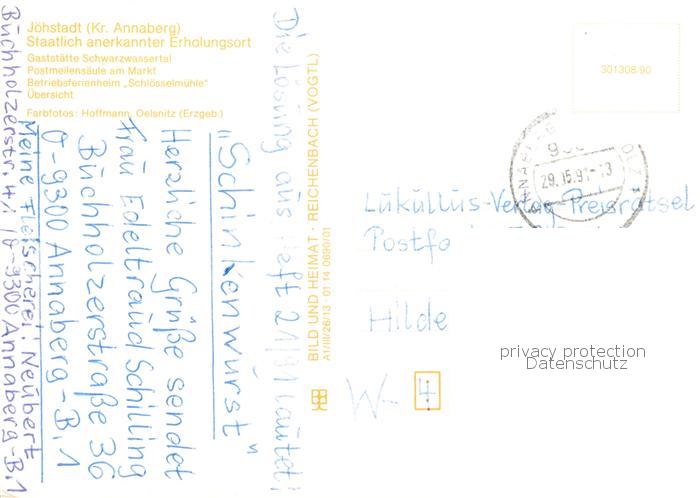 73812956 alte Postkarte Joehstadt Gaststaette Schwarzwassertal Postmeilensaeule Betriebsferienheim Schloesslemuehle uebersicht postalisch gelaufen Erhaltung siehe scans [WerneD78] KatCode: 11110014171190
