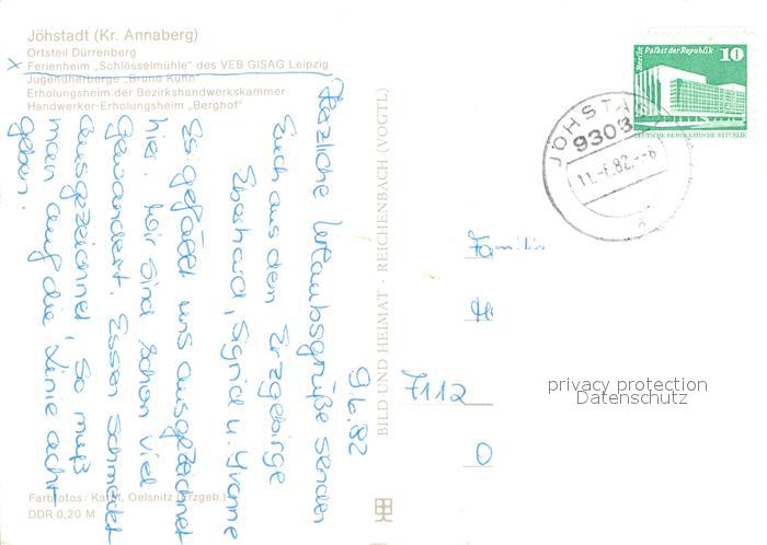 73606961 alte Postkarte Joehstadt OT Duerrenberg Ferienheim Schloesselmuehle Jugendherberge Bruno Kuehn Handwerker Erholungsheim Berghof postalisch gelaufen Erhaltung siehe scans [WerneD78] KatCode: 11110014171190