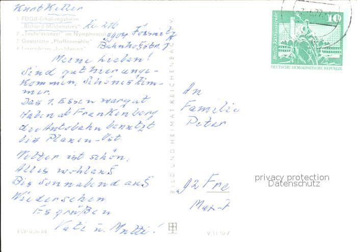 72357831 alte Postkarte Joessnitz FDGB Erholungsheim Mildenstrey Teufelskanzel Nymphental Gaststaette Ferienheim postalisch gelaufen Erhaltung siehe scans KatCode: 11110014166000