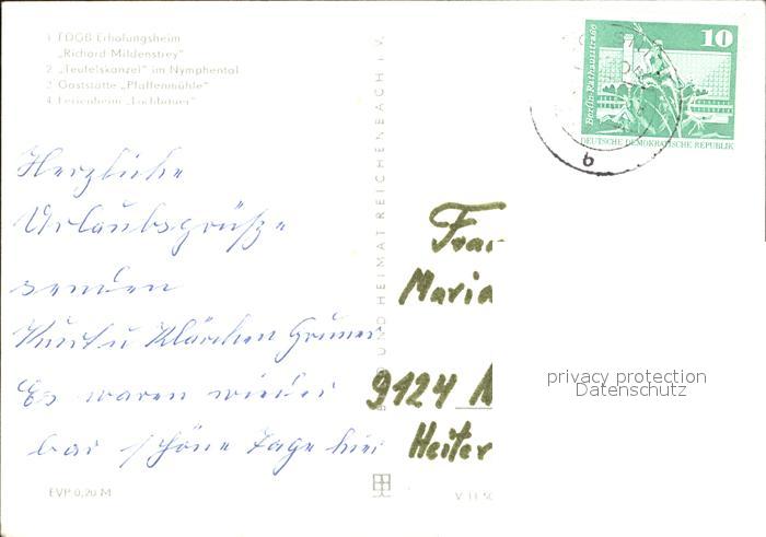72430610 alte Postkarte Joessnitz FDGB Erholungsheim Teufelskanzel Nymphental Gaststaette Pfaffenmuehle Ferienheim Lochbauer postalisch gelaufen Erhaltung siehe scans KatCode: 11110014166000