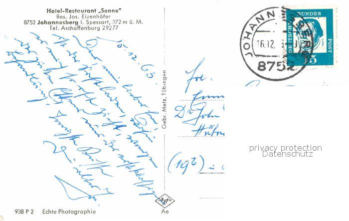 32657240 alte Postkarte Johannesberg Unterfranken Hotel-Restaurant Sonne postalisch gelaufen Erhaltung siehe scans [AndreD76] KatCode: 11110009671133