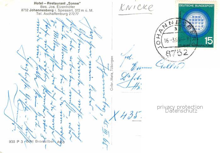 72650181 alte Postkarte Johannesberg Unterfranken Hotel Sonne postalisch gelaufen Erhaltung siehe scans [NatalD47] KatCode: 11110009671133