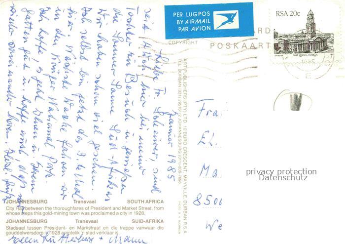 74091482 old postcard JOHANNESBURG Gauteng Southafrica RSA City Hall and Market Street postalisch gelaufen Erhaltung siehe scans [WerneD78] KatCode: 18460