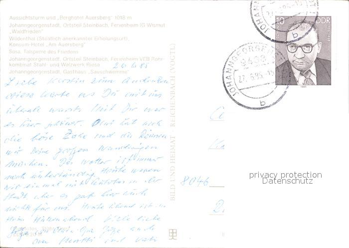 72372707 alte Postkarte Johanngeorgenstadt Auersberg Aussichtsturm Berghotel Steinbach Ferienheim Waldfrieden postalisch gelaufen Erhaltung siehe scans KatCode: 11110014191180