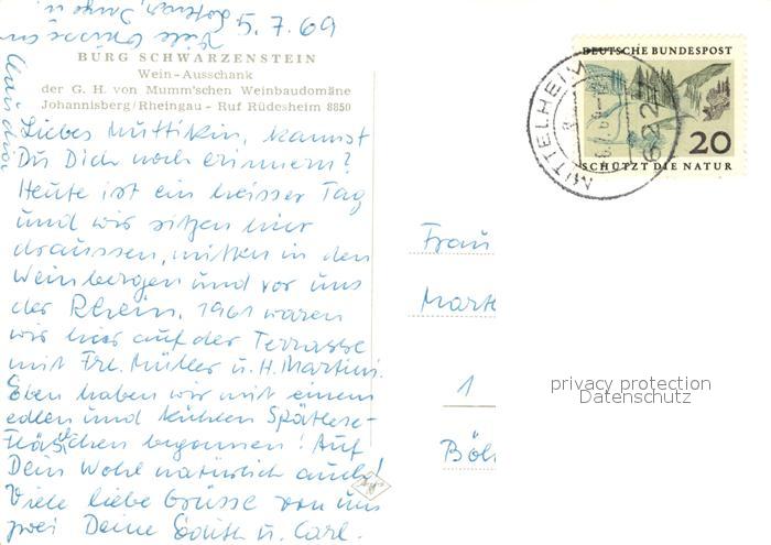 73135044 alte Postkarte Johannisberg Rheingau Burg Schwarzenstein postalisch gelaufen Erhaltung siehe scans [FriedD77] KatCode: 11110006439004