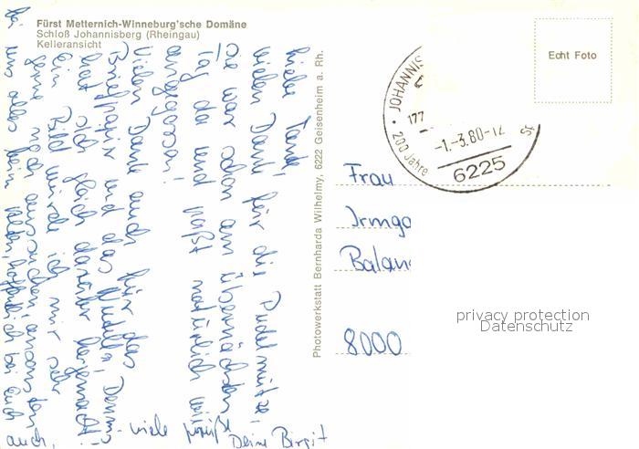 72695243 alte Postkarte Johannisberg Rheingau Fuerst Metternich-Winneburgsche Domaene Sekt-Keller postalisch gelaufen Erhaltung siehe scans [LiesaD40] KatCode: 11110006439004