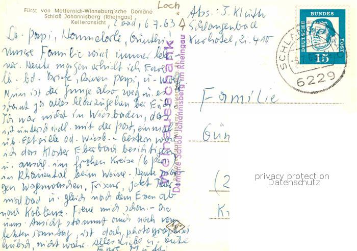 72812780 alte Postkarte Johannisberg Rheingau Fuerst von Metternich Winneburgsche Domaene Schloss Keller postalisch gelaufen Erhaltung siehe scans [FriedD77] KatCode: 11110006439004