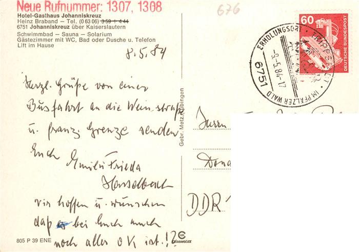 73902892 alte Postkarte Johanniskreuz Trippstadt Hotel Gasthaus Johanneskreuz postalisch gelaufen Erhaltung siehe scans [WerneD78] KatCode: 11110007335047