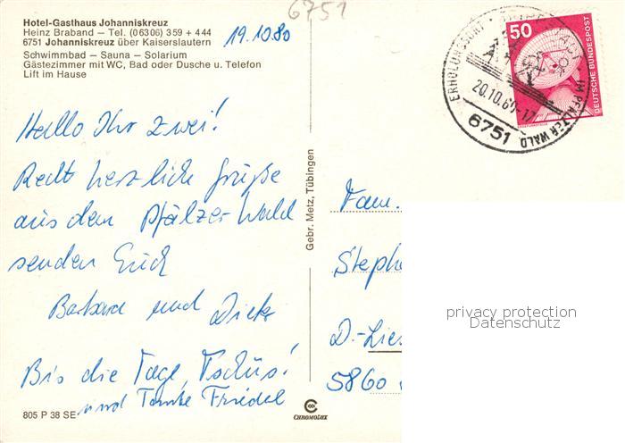 73870825 alte Postkarte Johanniskreuz Trippstadt Hotel Gasthaus Johanniskreuz postalisch gelaufen Erhaltung siehe scans [WerneD78] KatCode: 11110007335047