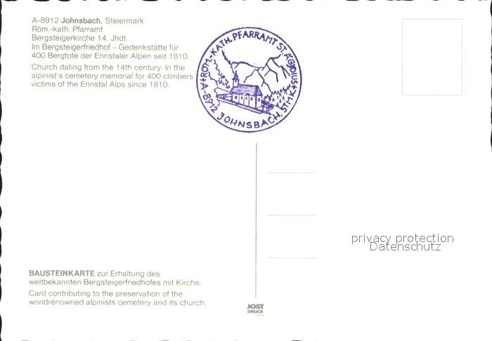 72207449 Johnsbach Steiermark Kath Pfarramt Bergsteigerkirche Bergsteigerfriedhof Gedenkstaette fuer 400 Bergtote der Ennstaler Alpen postalisch nicht gelaufen Erhaltung siehe scans KatCode: 11390222061219