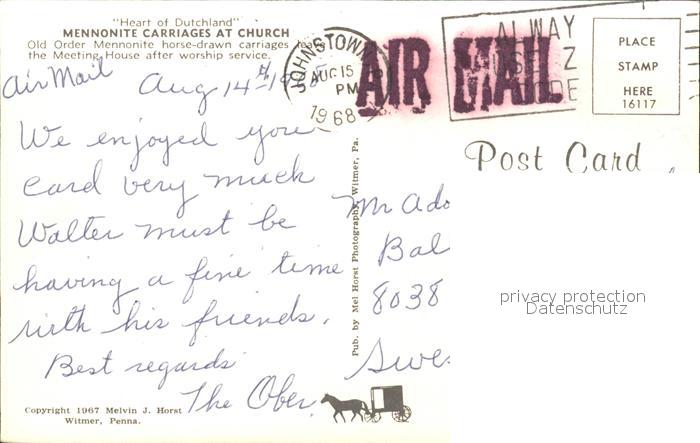 11686254 old postcard Johnstown Pennsylvania Mennonite Carriages at Church Pferdewagen postalisch gelaufen Erhaltung siehe scans KatCode: 14140410000000