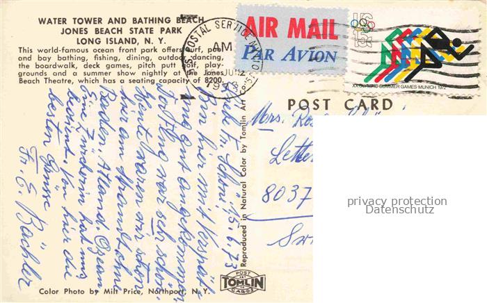 74132451 old postcard Jones Beach Long Island City New York USA Water Tower Bathing Beach postalisch gelaufen Erhaltung siehe scans [IrynaD87] KatCode: 14140340000000