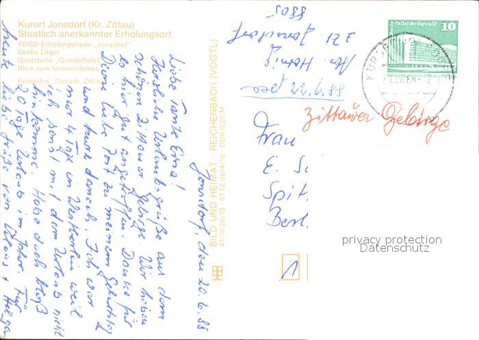 72263328 alte Postkarte Jonsdorf FDGB- Erholungsheim Jonashof Gaststaette Gondelfahrt Nonnenfelsen postalisch gelaufen Erhaltung siehe scans KatCode: 11110014286180