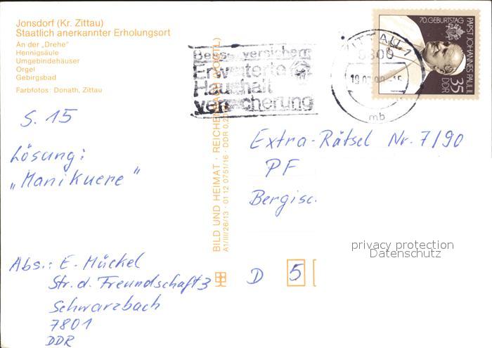 72461598 alte Postkarte Jonsdorf Kurort An der Drehe Hennigsaeule Umgebindehaeuser Orgel postalisch gelaufen Erhaltung siehe scans KatCode: 11110014286180