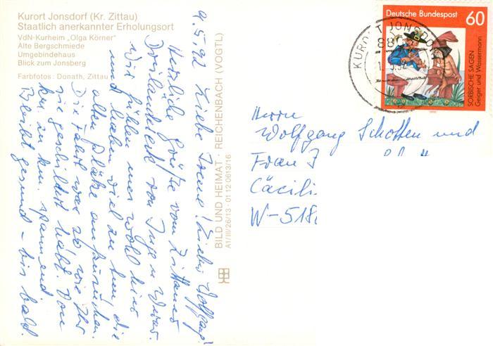 73914105 alte Postkarte Jonsdorf Saechsische Schweiz Bdn Kurheim Olga Koerner Alte Bergschmiede Umgebindehaus Blick zum Jonsberg postalisch gelaufen Erhaltung siehe scans [WerneD78] KatCode: 11110014286180
