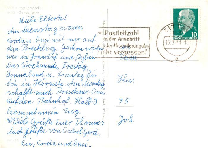 73946767 alte Postkarte Jonsdorf Saechsische Schweiz HOG Gondelfahrt postalisch gelaufen Erhaltung siehe scans [FriedD77] KatCode: 11110014286180