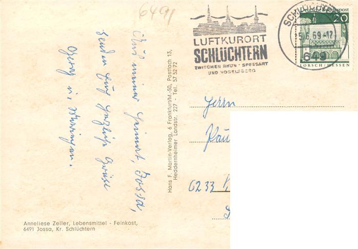 73890710 alte Postkarte Jossa Schluechtern Lebensmittelgeschaeft Zeller Autobahnbruecke Panorama Turm postalisch gelaufen Erhaltung siehe scans [WerneD78] KatCode: 11110006435027