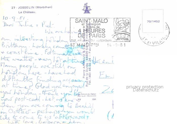 12662301 carte postale Josselin Chateau Schloss postalisch gelaufen Erhaltung siehe scans [FriedD77] KatCode: 11170056256091