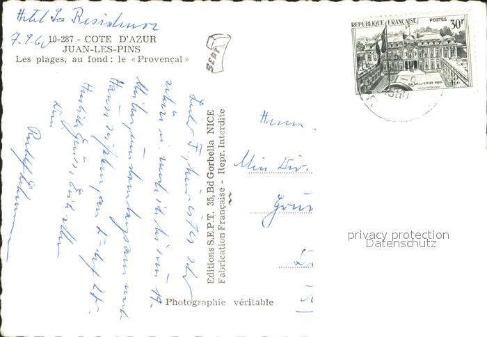 12299275 carte postale Juan-les-Pins Antibes 06 Les plages au fond le Provencal postalisch gelaufen Erhaltung siehe scans KatCode: 11170006106004