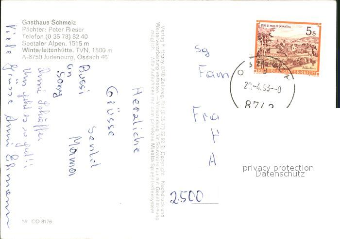 72492410 alte Postkarte Judenburg Steiermark Gasthaus Schmelz Winterleitenhuette Seetaler Alpen postalisch gelaufen Erhaltung siehe scans KatCode: 11390226060806