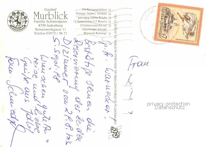 12780313 alte Postkarte Judenburg Steiermark Gasthof Murblick Gedeckte Tafel Terrasse postalisch gelaufen Erhaltung siehe scans [WerneD78] KatCode: 11390226060806