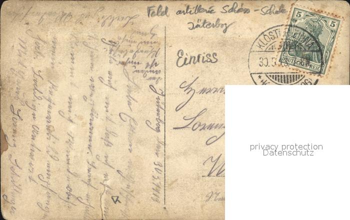 32421078 alte Postkarte Jueterbog Feldartillerie Schiess Schule Hund WK1 postalisch gelaufen Erhaltung siehe scans KatCode: 11110012072169