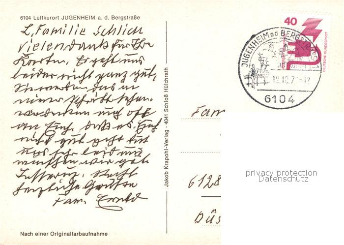 73001025 alte Postkarte Jugenheim Seeheim-Jugenheim Fliegeraufnahme postalisch gelaufen Erhaltung siehe scans [AndreD76] KatCode: 11110006432022
