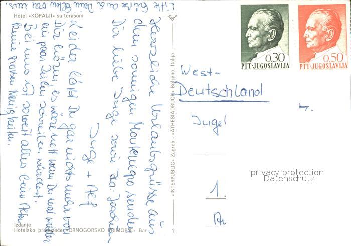 old postcard Jugoslawien Yugoslavie Hotel Koralji Terrasse Strand postalisch gelaufen Erhaltung siehe scans