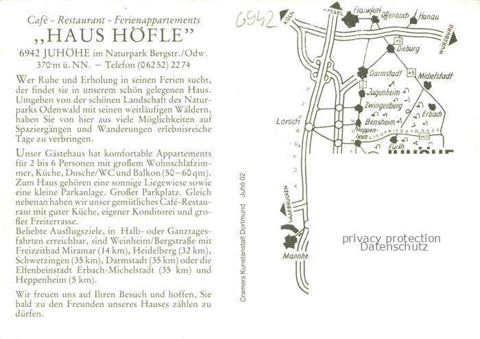 74048101 Juhoehe Moerlenbach Bergstrasse Hessen Café Restaurant Appartements Haus Hoefle postalisch nicht gelaufen Werbekarte (keine Postkarte) Erhaltung siehe scans [FriedD77] Werbekarte (keine Postkarte) Frie Katcode 11110006431017