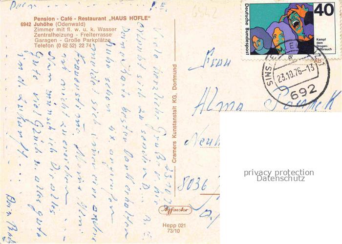 74048040 Juhoehe Moerlenbach Bergstrasse Hessen Pension Café Restaurant Haus Hoefle postalisch gelaufen Erhaltung siehe scans [FriedD77] alte Postkarte Frie Katcode 11110006431017