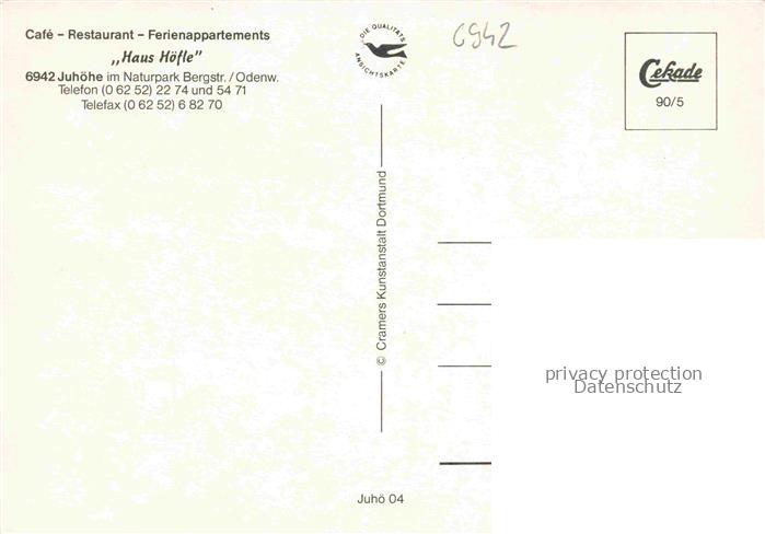 74048062 Juhoehe Moerlenbach Bergstrasse Hessen Pension Café Restaurant Haus Hoefle Gastraum Terrasse postalisch nicht gelaufen Erhaltung siehe scans [FriedD77] Frie Katcode 11110006431017