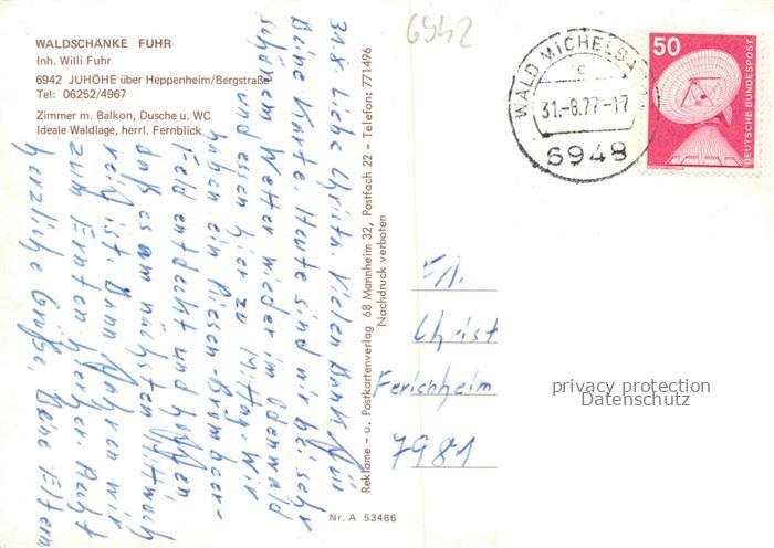 74048038 Juhoehe Moerlenbach Bergstrasse Hessen Waldschaenke Fuhr Gastraeume postalisch gelaufen Erhaltung siehe scans [FriedD77] alte Postkarte Frie Katcode 11110006431017