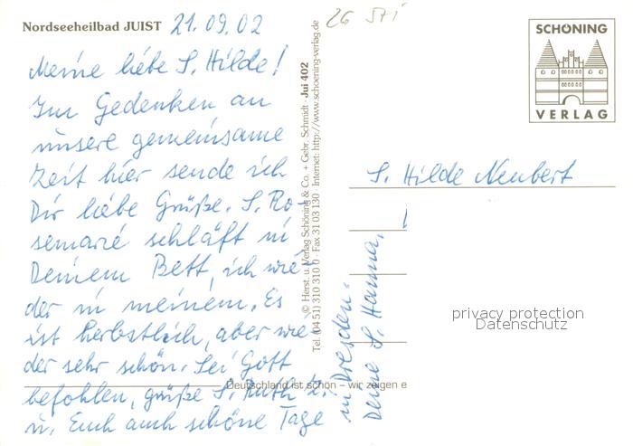 73715484 alte Postkarte Juist Nordseebad Gruene Insel im Meer Seehund Strand Promenade Memmertfeuer Pferdebus Kurhotel Ortsmotiv postalisch gelaufen Erhaltung siehe scans [FriedD77] KatCode: 11110003452013