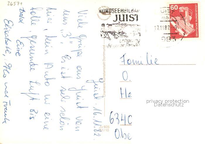 73715475 alte Postkarte Juist Nordseebad Wellenbad Kinderspielplatz Anleger Pferdebus Duenen Abendsonne Strand Tennisplaetze Wattwanderung Inselbahn Fliegeraufnahme postalisch gelaufen Erhaltung siehe scans [FriedD77] KatCode: 11110003452013