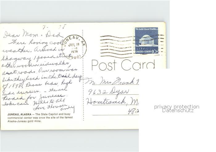 72329267 old postcard Juneau Alaska The State Capital and busy commercial center postalisch gelaufen Erhaltung siehe scans KatCode: 14140020000000