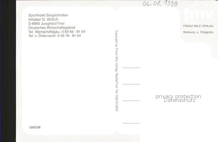 72240281 Jungholz Tirol Hotel Restaurant Cafe Sorgschrofen Alpenpanorama postalisch nicht gelaufen Erhaltung siehe scans KatCode: 11390331070818